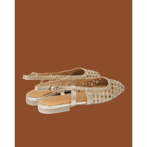De Marie is de flat die je pakt als je er verzorgd wilt uitzien zonder moeite. Een gevlochten leren bovenkant in metallic champagne goud, een slingback riem die je op je plek houdt en een flexibele zool die de hele dag met je meebeweegt